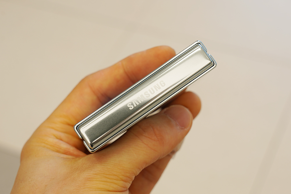 갤럭시 Z 플립5의 옆면을 살펴보면 약간은 플랫한 느낌의 메탈로 제작되었고 잠금 해제를 위한 지문인식 센서가 배치되어 있습니다. 위치는 적절한 편이라고 판단되었습니다.