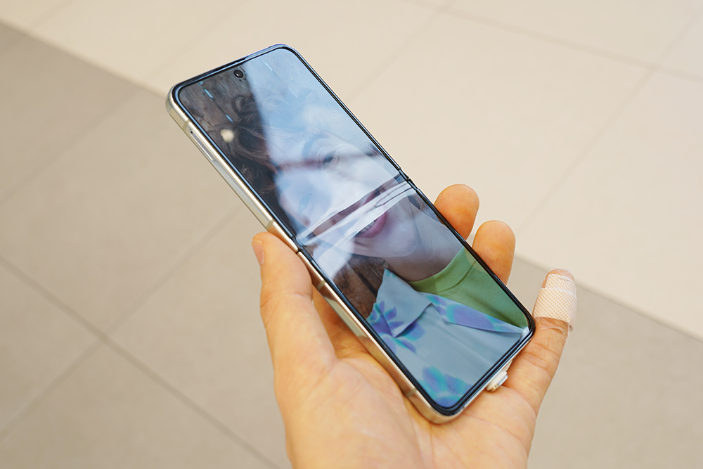 갤럭시 Z 플립5에는 6.7인치(170.3mm) FHD+(2640 x 1080) 해상도의 다이내믹 AMOLED 2X 인피니티 플렉스 디스플레이가 탑재되었습니다. 이전 세대의 제품과 비교해서 내구성이 높아졌다고 하지만 주름은 크게 개선된 것 같지는 않습니다. 그리고 크기는 성인 남성이나 여성이 한 손으로 사용하기에 크게 부담이 되는 편은 아니라고 판단되었습니다.