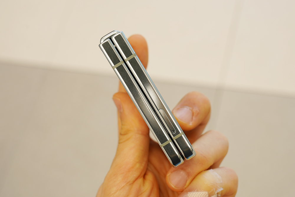 갤럭시 Z 플립5를 펼쳤을 때의 두께는 6.9mm입니다. 플립4와 같은데요. 이미 상당히 얇은 느낌이어서 더욱 얇아진다면 오히려 강성이라든지 사용성이 떨어질 것 같습니다. 그리고 힌지 부분은 단단하게 밀착되는 것을 확인할 수 있습니다.