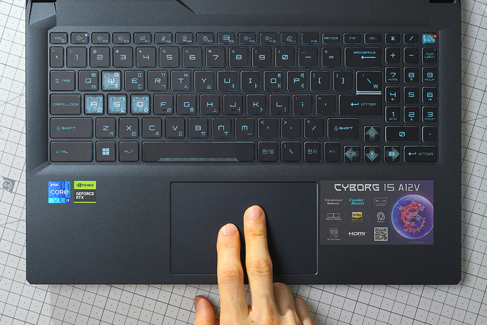 MSI 사이보그 15 A12VF의 키보드는 숫자 패드가 포함되어 있어서 각종 콘텐츠 편집 작업 용도로도 활용할 수 있습니다. 그리고 WASD 키는 반투명하게 처리되었고 방향키는 하이라이트되어 있다는 점이 차별화된 특징이라고 판단되었습니다.