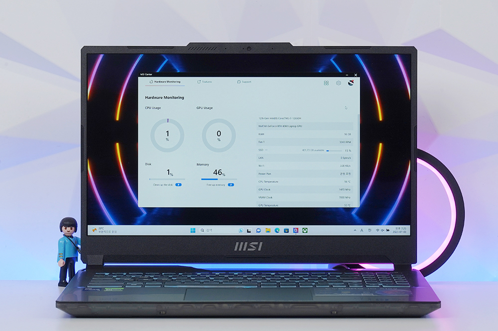 마지막으로 MSI 사이보그 15 A12VF는 MSI Center(센터)라는 프로그램을 통해서 현재 상태를 확인하고 유저 시나리오를 변경할 수 있습니다. 상황에 맞춰서 적절하게 활용해주는 것이 좋을 것 같습니다.
