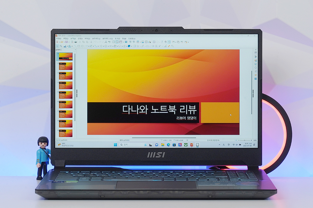 MSI 사이보그 15 A12VF의 두께는 21.95mm이고 무게는 약 2.02kg으로 측정되었습니다. 고성능 게이밍 노트북을 설계되었다는 점을 고려하면 휴대성은 좋은 편이라고 판단되었습니다.