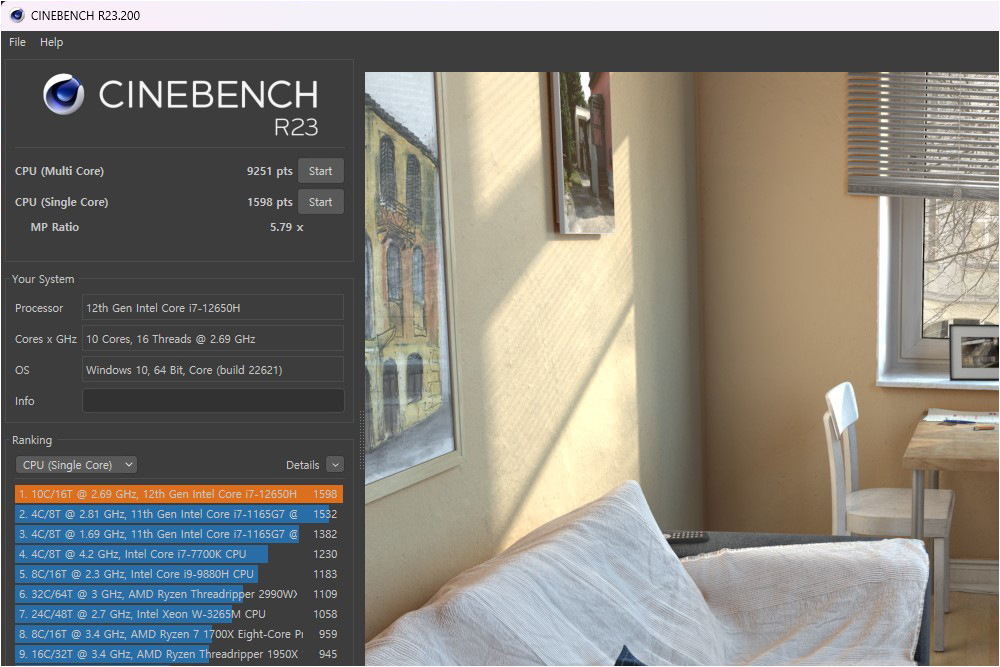 12세대 인텔® 코어™ i7-12650H의 성능을 씨네벤치(CINEBENCH R23.200)을 이용해서 확인해 보면 멀티코어는 9,251점(pts), 싱글코어는 1,598점(pts)으로 측정되었습니다.