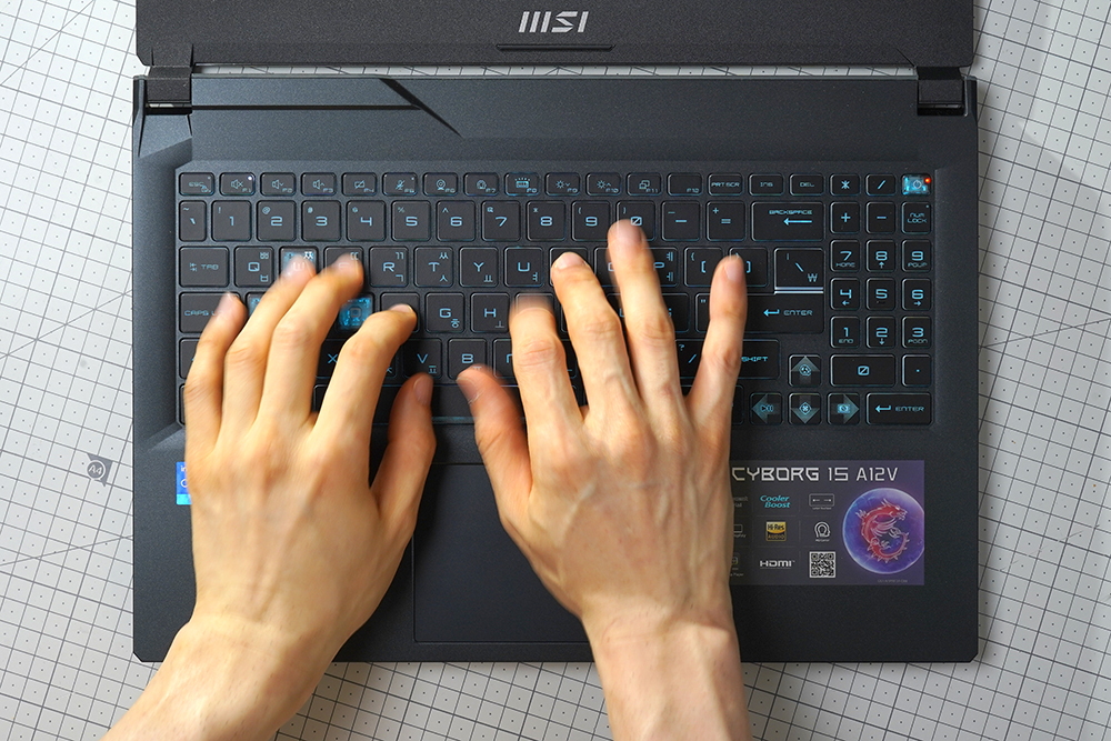 MSI 사이보그 15 A12VF 키보드의 키감은 깔끔한 느낌을 주는 편입니다. 그래서 장시간 게임을 플레이하거나 문서 작업을 해도 크게 피로할 것 같지는 않습니다. 특히 저는 WASD 키 디자인이 인상적이었습니다.