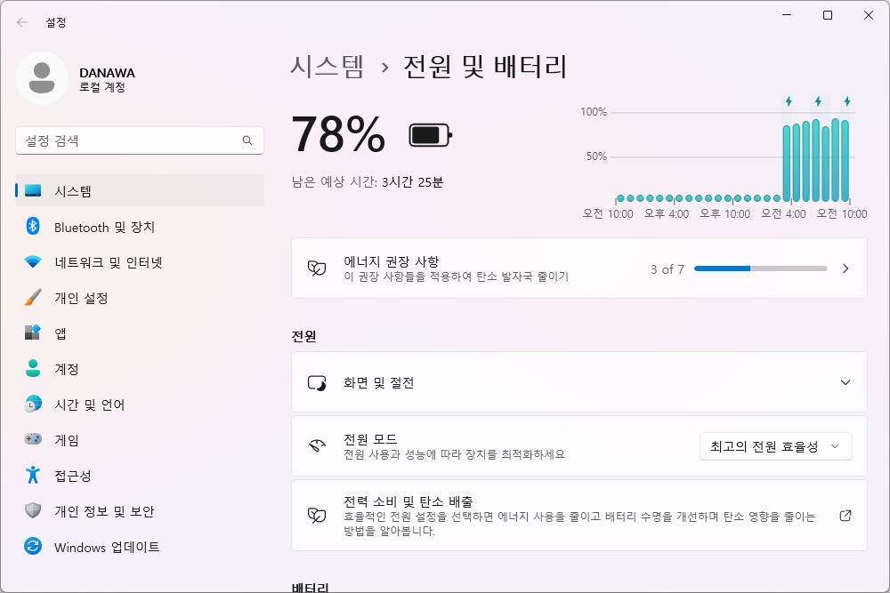 MSI 사이보그 15 A12VF에는 3셀 53.5WHr 용량의 배터리가 탑재되었고 화면 밝기 100%에서 유튜브 영상을 1시간 시청했을 때 약 78% 정도가 남아 있었습니다. 참고로 사용 시간은 디스플레의 밝기나 설정에 따라서 차이가 날 수 있습니다.
