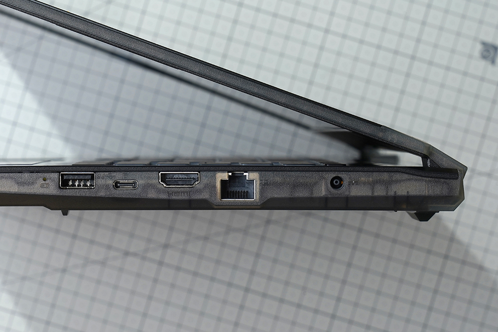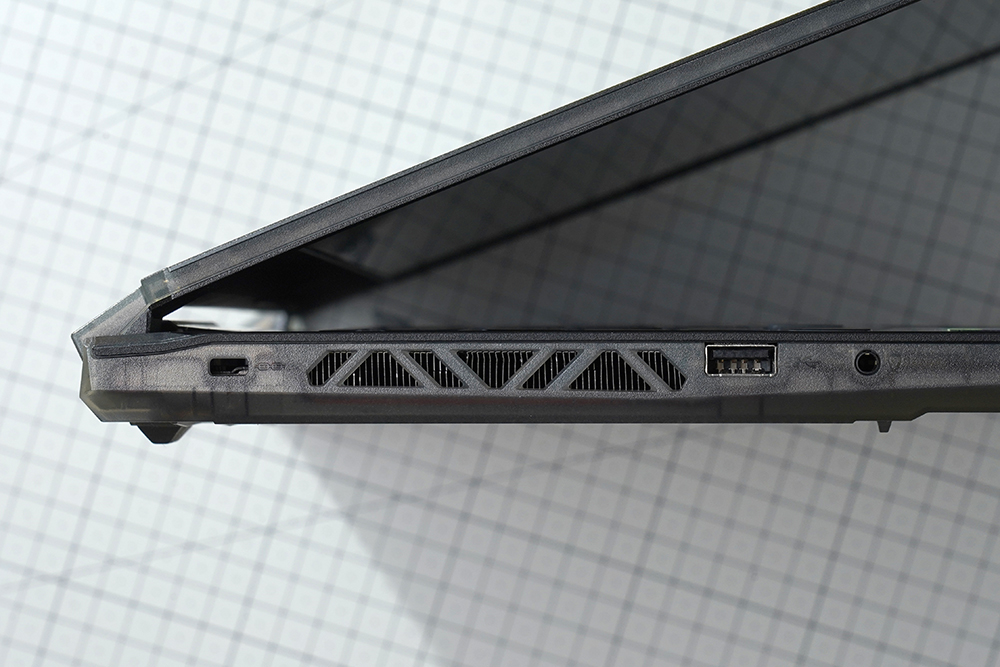 MSI 사이보그 15 A12VF의 입출력 포트를 살펴보면 왼쪽에는 분실을 방지하기 위한 켄싱턴락 홈과 USB 3.2 타입A 그리고 마이크 입력 / 헤드폰 출력 오디오 콤보 잭이 배치되어 있습니다.