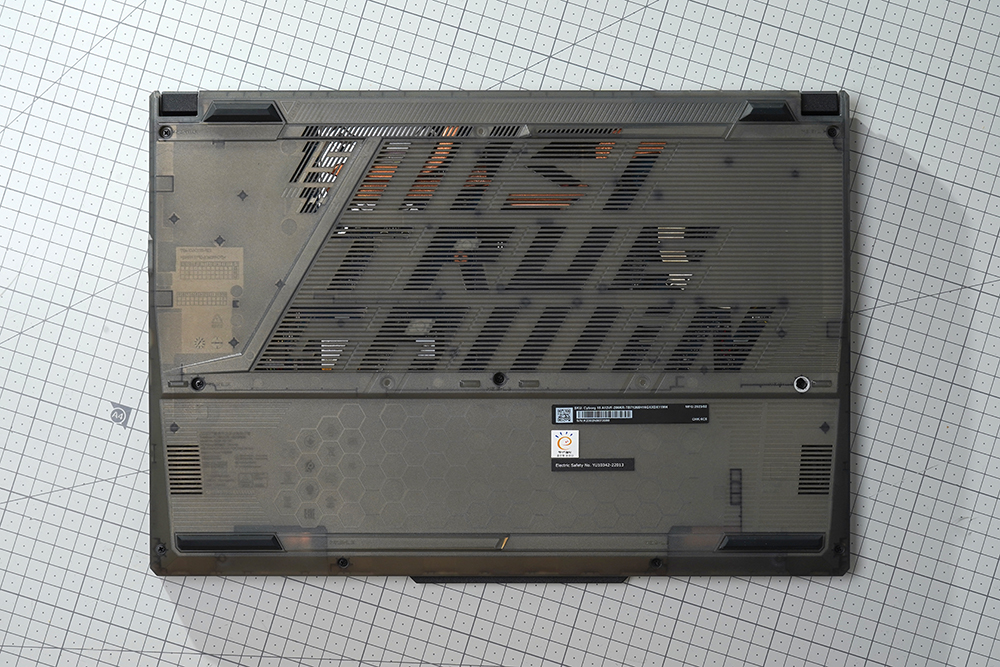 바닥을 살펴보면 역시 일부에 반투명 디자인이 적용되었고 특히 독특한 패턴과 함께 캘리그라피 디자인 통풍구가 인상적이었습니다. 그리고 모서리 부분에는 고무 지지대가 배치되어 있어서 책상 위에서 잘 미끄러지지 않습니다.