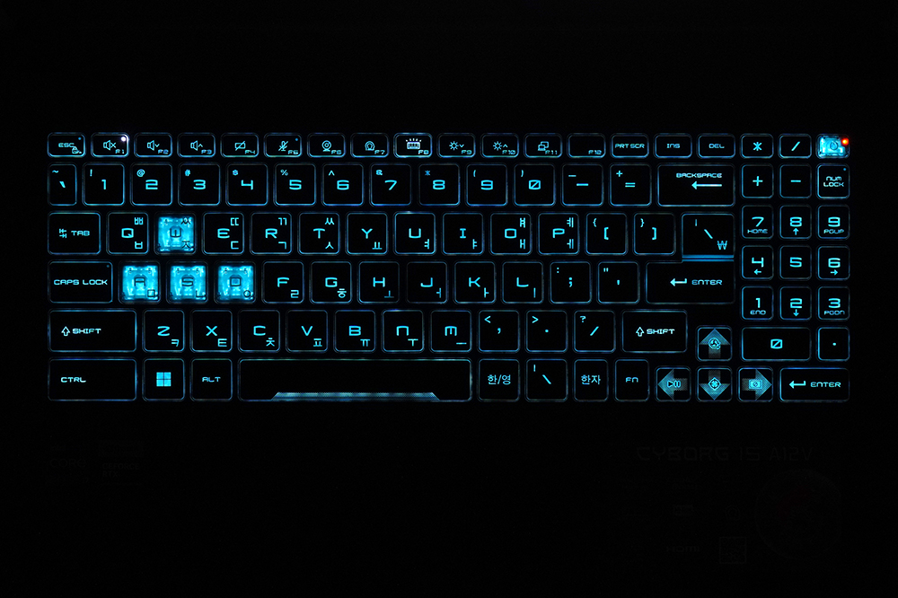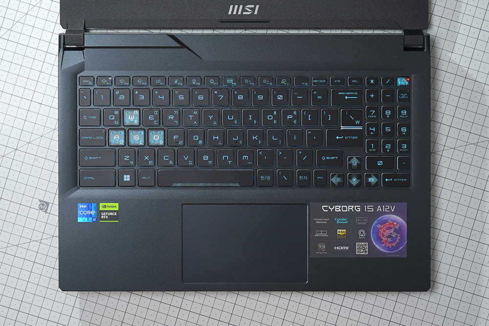 MSI 사이보그 15 A12VF의 키보드는 숫자 패드가 포함되어 있어서 각종 콘텐츠 편집 작업 용도로도 활용할 수 있습니다. 그리고 WASD 키는 반투명하게 처리되었고 방향키는 하이라이트되어 있다는 점이 차별화된 특징이라고 판단되었습니다.