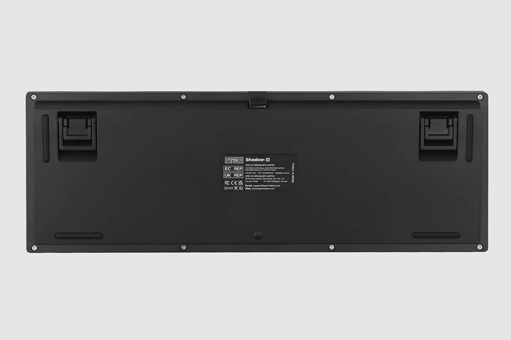 Epomaker Shadow-X 커스텀 키보드의 바닥은 심플한 스타일로 디자인되었고 커스텀 키보드에는 찾아보기 힘든 각도를 변경할 수 있는 지지대가 배치되어 있다는 점이 독특한 부분입니다.