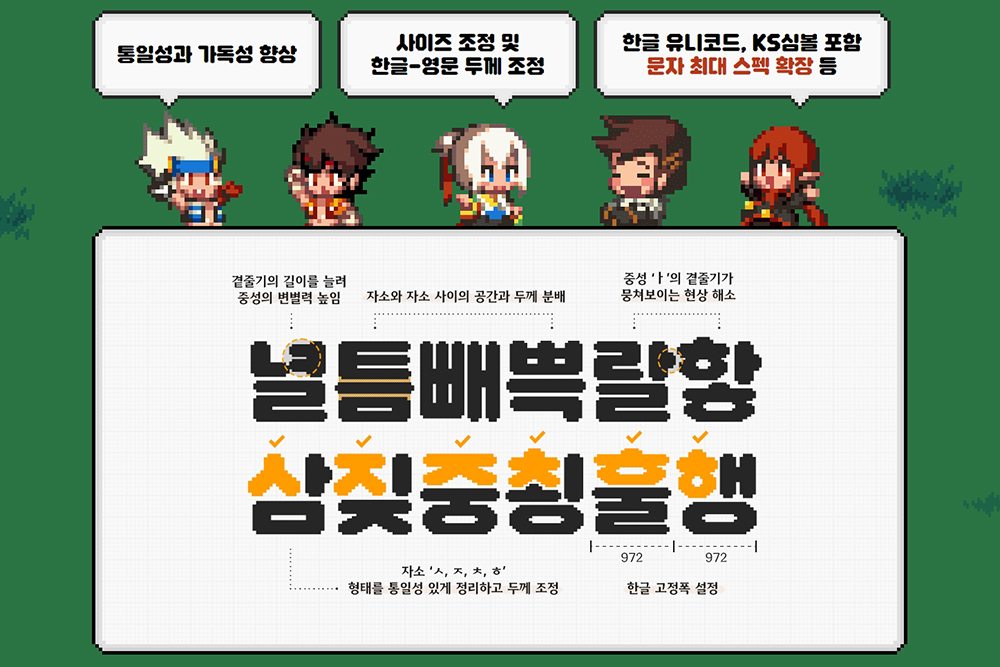 던파 연단된 칼날 폰트는 톱니바퀴를 모티브로 디자인되었는데요. 그래픽 요소가 들어간 자소와 세리프가 포인트라고 할 수 있고 통쾌한 타격감과 액션감을 느낄 수 있도록 설계되었습니다. 디자인적인 요소가 강한 편이어서 제목에 활용해도 좋을 것 같습니다.