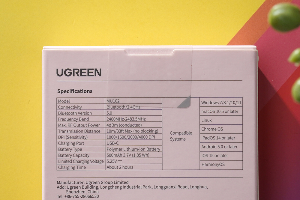 박스의 뒷면을 살펴보면 유그린 충전식 무선 마우스 MU102의 스펙이 표시되어 있습니다. 주목할만한 부분은 최대 4,000DPI(1000/1600/2000/4000)를 지원한다는 점입니다. 그래서 4K 이상의 해상도를 가진 화면에서 더욱 빠르게 마우스 커서를 움직일 수 있습니다.