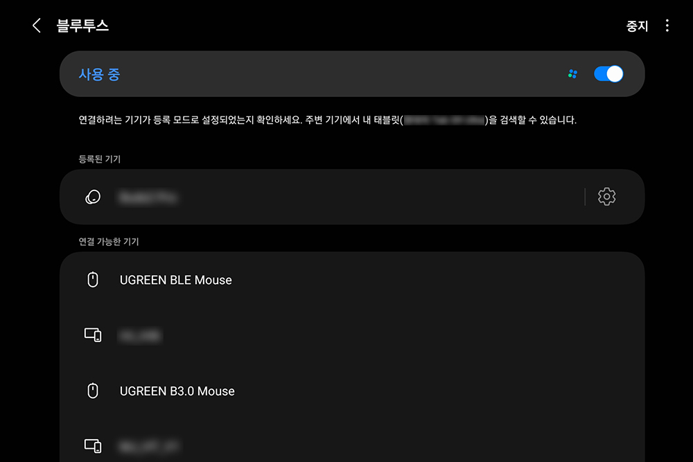 유그린 충전식 무선 마우스 MU102는 태블릿이나 스마트폰에 연결해서 사용할 수도 있습니다. 우선 페어링 모드로 들어가면 UGREEN BLE Mouse나 UGREEN B3.0 Mouse 중에서 선택해서 연결해주면 됩니다.