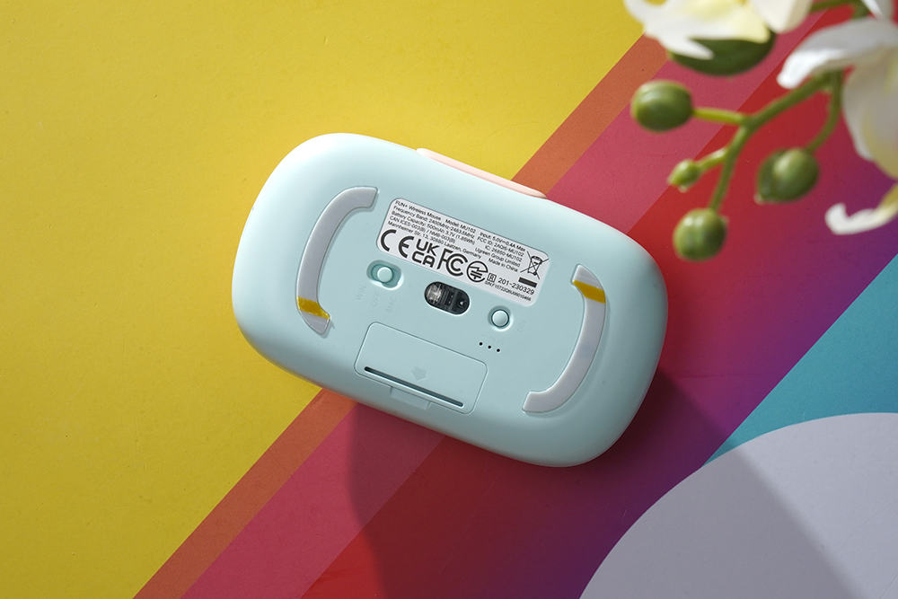 바닥의 중간을 살펴보면 윈도우와 맥OS를 전환할 수 있는 시스템 스위치 버튼과 옵티컬 센서 그리고 2.4G/블루투스 LED 인디케이터와 DPI 스위치 버튼이 배치되어 있습니다. 그 외에도 2.4GHz USB 무선 수신기를 내부에 수납할 수 있어서 분실을 방지할 수 있습니다.