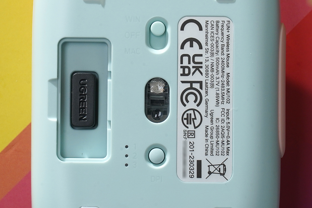 유그린 충전식 무선 마우스 MU102를 사용하는 방법은 간단한 편입니다. 우선 2.4GHz 수신기를 데스크톱 PC나 노트북에 연결하고 DPI 스위치 버튼을 이용해서 1번 LED로 설정하면 별다른 소프트웨어 설치 없이도 바로 이용할 수 있습니다.