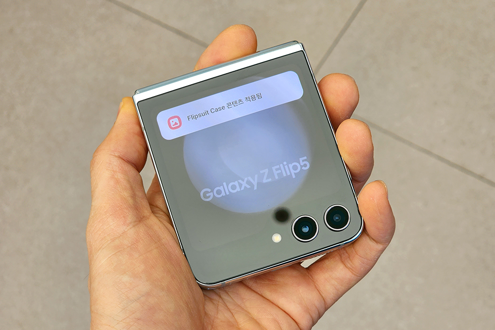 갤럭시Z 플립5의 수트 케이스와 플립수트 카드의 주요 특징은 카드를 교체하는 것만으로도 커버 디스플레이에 특별한 콘텐츠가 재생된다는 점입니다. 재미있는 부분은 단순한 사진이 아니라 움직이는 배경이라는 점입니다. 그래서 디자인적인 통일성이 높은 편입니다.
