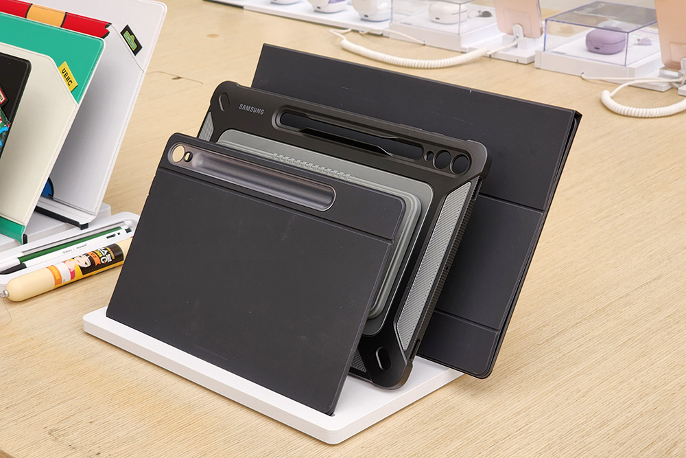 우선 스마트 북커버의 경우에는 갤럭시 탭 S9, S9+, S9 Ultra 모두를 위한 제품이 출시되었습니다. 재미있는 부분은 뒤쪽에 가로나 세로로 세워서 사용할 수 있는 스탠드가 배치되어 있다는 점입니다. 특히 내부에 금속이 들어가 있는지 상당히 단단한 느낌을 주는 편이라는 점이 유용한 부분입니다. 가격은 S9용은 99,000원(회원가 96,000원), S9 플러스는 110,000원(회원가 106,700원), S9 울트라는 132,000원(회원가 128,000원)입니다.