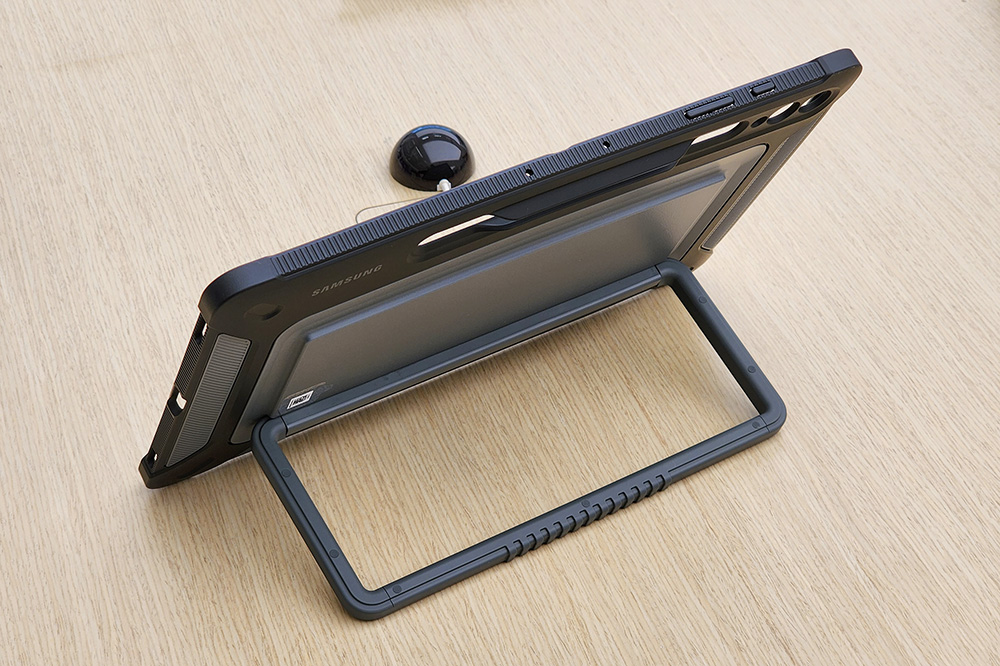 그리고 뒤쪽에는 스탠드가 배치되어 있어서 최대 60도까지 각도를 조절할 수 있도록 제작되었습니다. 그리고 자석이 내장되어 있어서 S펜 전용 액세서리를 부착할 수 있다고 합니다. 전체적으로 디자인도 깔끔하고 보호력도 좋은 편이라고 생각되었지만, 두께는 제법 두꺼운 편입니다. 참고로 가격은 기준가 77,000원(회원가 74,600원)입니다.
