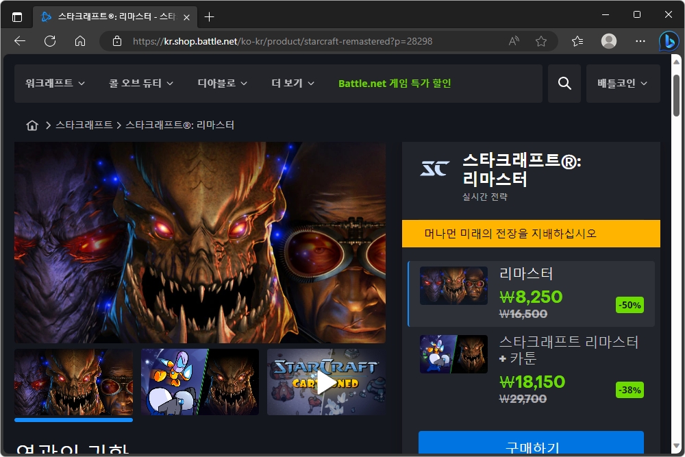 최근 이시아 배우님도 플레이하고 있는 것을 알려져서 화제가 되는 민속놀이 스타크래프트®: 리마스터도 할인을 진행하고 있습니다. 가격은 8,250원(정가 16,500원)이고 카툰 버전은 18,150원(정가 29,700원)입니다.