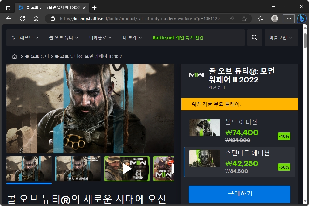 콜 오브 듀티®: 모던 워페어 II 2022의 경우엔느 볼트 에디션이 74,400원(정가 74,400원)이고 스탠다드 에디션이 42,250원(정가 84,500원)입니다. 콜 오브 듀티®: 모던 워페어 III 2023이 출시를 앞두고 있어서 시리즈를 완성하려고 하시는 분들은 구매해서 소장하시길 바랍니다.