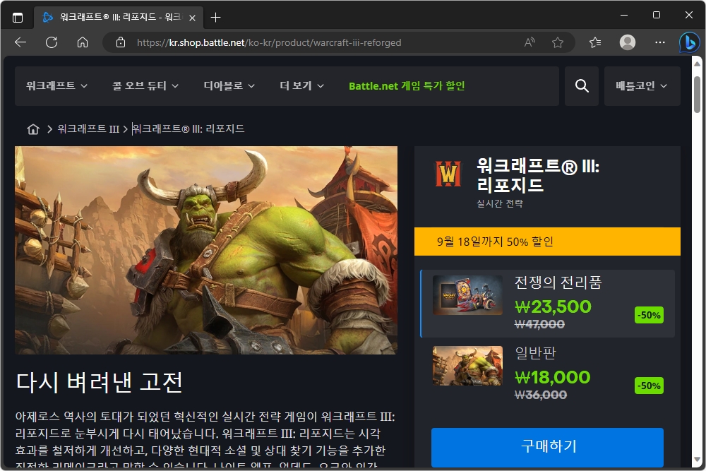 워크래프트® lll: 리포지드의 경우에는 전쟁의 전리품은 23,500원(정가 47,000원)이고 일반판은 18,000원(정가 36,000원)입니다. 예전 추억이 있는 분들이라면 한 번 플레이해 보시길 바랍니다.