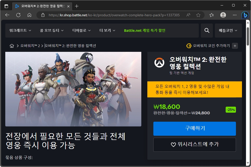 오버워치™ 2: 완전한 영웅 컬렉션도 18,600원(정가 24,800원)에 완전한 영웅 컬렉션을 판매하고 있습니다. 무료 게임이기는 하지만 1500 크레딧과 스킨이 포함되어 있으니 현재도 플레이하고 있는 분들은 구매할 메리트가 있을 것으로 예상합니다.