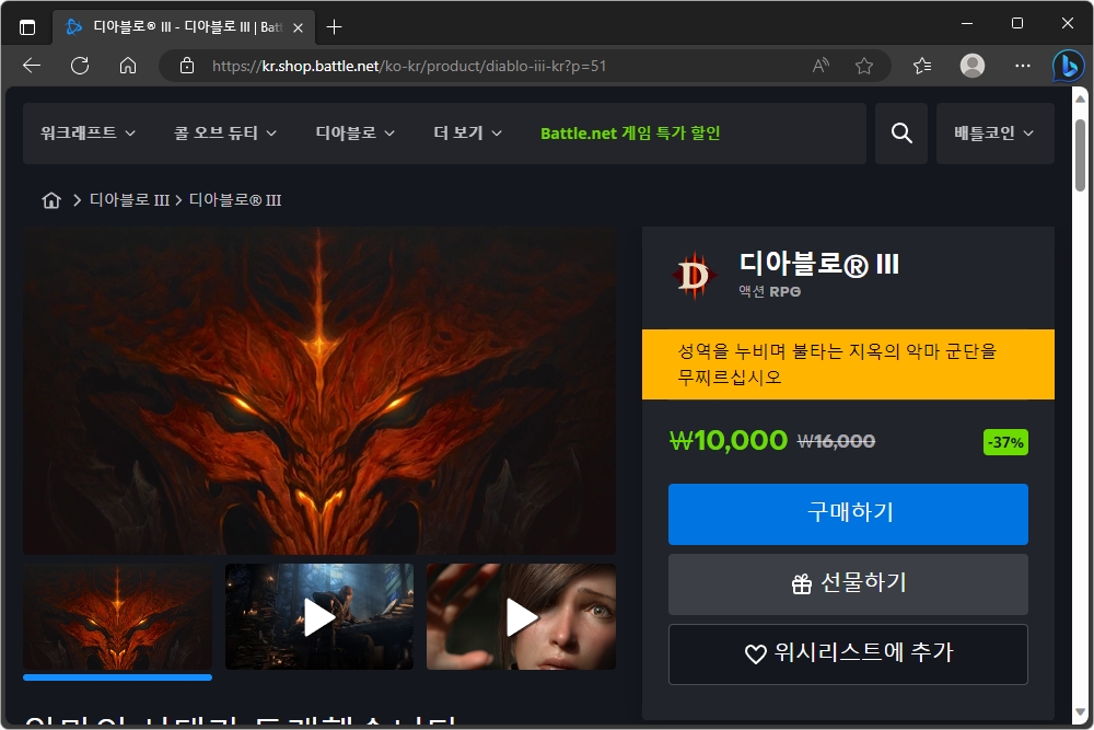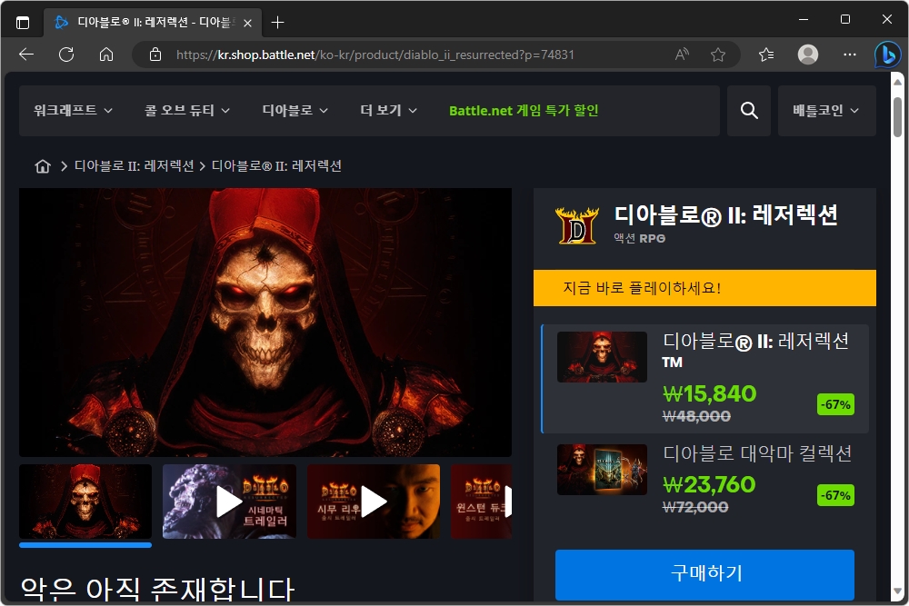 디아블로® III와 디아블로® II: 레저렉션도 각각 할인이 진행 중입니다. 가격은 디아블로3가 10,000원(정가 16,000원)이고 디아블로2:레저렉션이 15,840원(정가 48,000)입니다. 디아블로 시리즈를 좋아하는 분들이라면 세트로 소장하시는 것을 추천합니다.