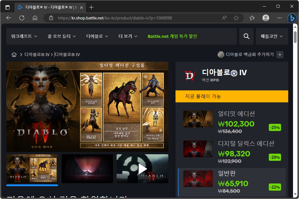 가장 먼저 살펴볼 게임은 디아블로® IV(디아블로4)입니다. 최근 플레이어가 감소했다는 소문도 있지만 그래도 여전히 인기가 있는 작품 중의 하나이고 최신 게임임에도 불구하고 할인하고 있다는 점이 이례적인 부분입니다. 가격은 얼티밋 에디션이 102,300원(정가 136,400원)이고 디지털 딜럭스 에디션이 98,320원(정가 122,900) 그리고 일반판이 65,910원(정가 84,500원)입니다. 평균 20% 정도 할인이 진행되고 있는 것을 확인할 수 있습니다.