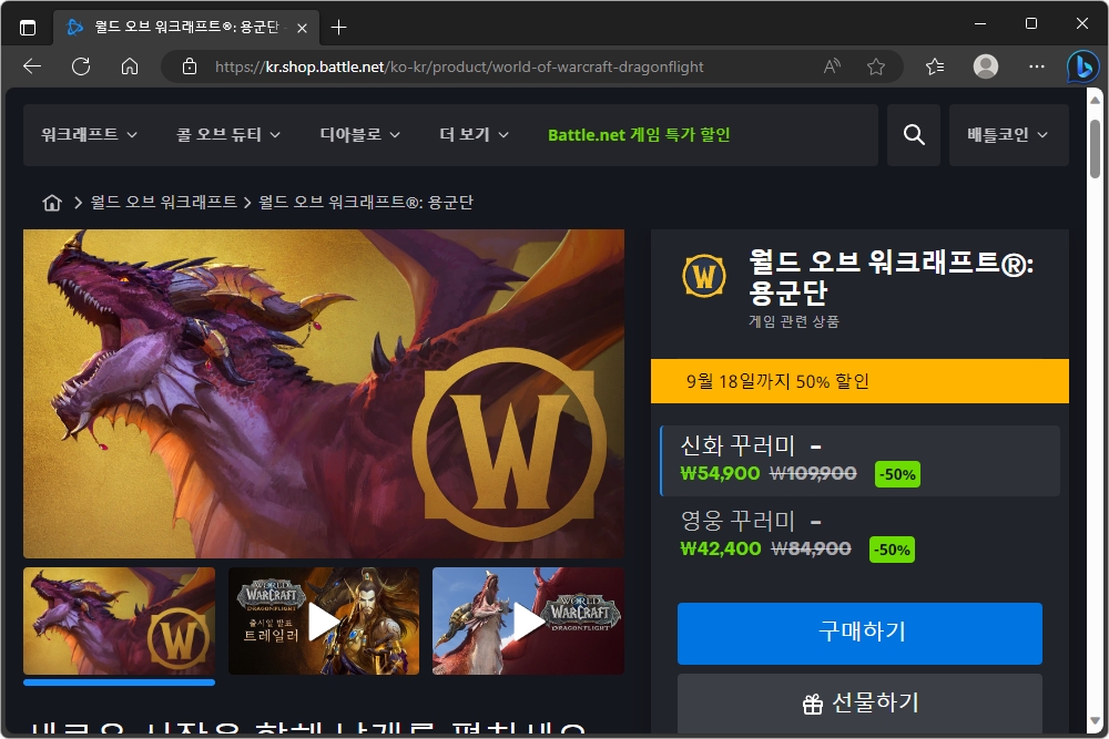 MMORPG 장르를 대표하는 게임이라고 할 수 있는 월드 오브 워크래프트®(WOW): 용군단도 세일을 진행하고 있습니다. 50% 할인율이 적용되어서 신화 꾸러미는 54,900원(정가 109,900원) 영웅 꾸러미는 42,400원(정가 84,900원)입니다.