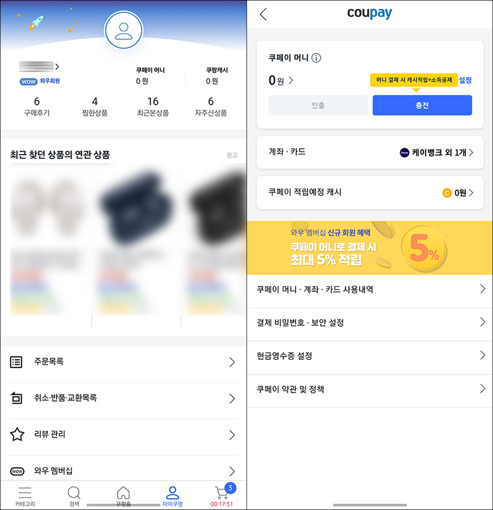 그리고 쿠팡 앱을 열어서 마이페이지의 결제 수단 메뉴에서 케이뱅크의 계좌번호나 카드번호를 연동하고 와우 멤버십을 신청해주면 됩니다. 과정 자체는 크게 어려운 편은 아니라고 판단되었습니다.