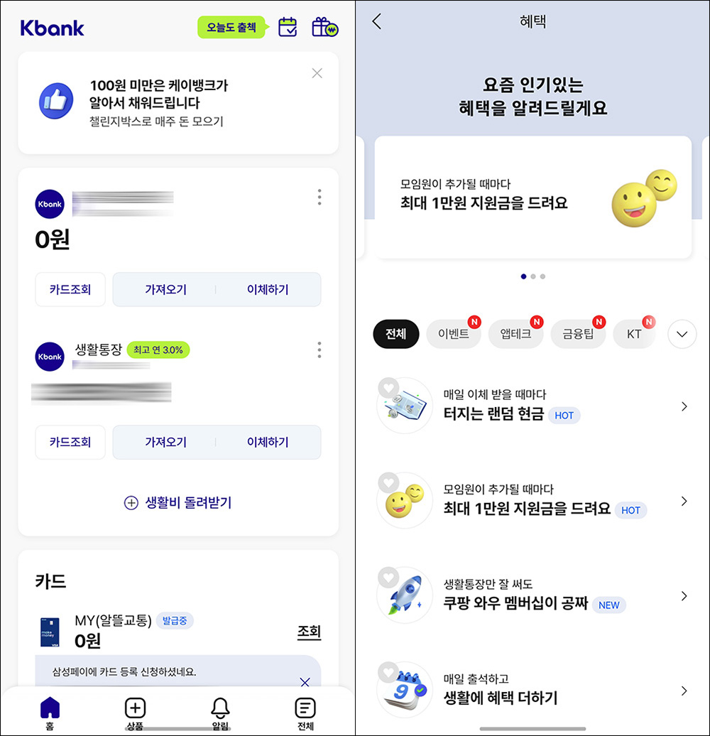 우선 케이뱅크(Kbank) 앱을 실행시키면 홈 화면에서는 현재 가입된 상품들의 리스트가 표시되고 전체 메뉴의 혜택 항목을 살펴보면 “생활통장만 잘 써도 쿠팡 와우 멤버십이 공짜”라는 이벤트가 진행되고 있는 것을 확인할 수 있습니다.