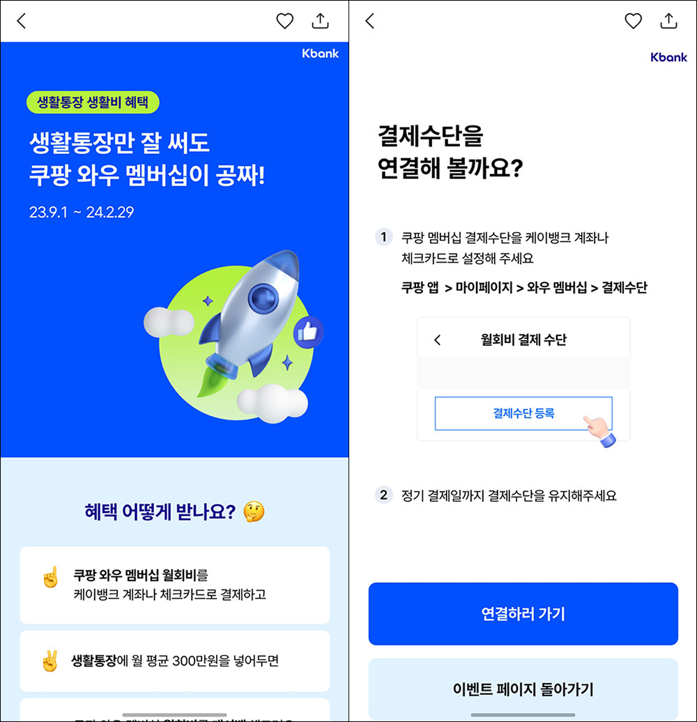 우선 케이뱅크(Kbank) 쿠팡 와우 멤버십 이벤트의 경우에는 2023년 9월 1일부터 2024년 2월 29일까지 진행되고 생활통장에 월평균 300만원을 넣어두고 쿠팡 와우 멤버십 월회비를 케이뱅크 계좌나 체크카드로 결제한 후에 아래쪽에 배치된 참여하고 혜택 받기라는 버튼을 눌러서 참여해야 합니다.