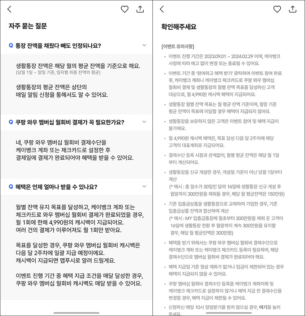 참고로 주의 사항을 확인해 보면 생활통장 잔액은 월 평균을 기준으로 300만원 이상이 채워져 있어야 하고 쿠팡 와우 멤버십 월회비 결제 수단이 케이뱅크 계좌나 체크카드로 설정되어 있어야 합니다. 그리고 월회비 캐시백은 4,990원이고 다음 달 2주차에 일괄 지급된다고 합니다. 참고로 2024년 2월 29일까지 한시적으로 진행되는 이벤트입니다.