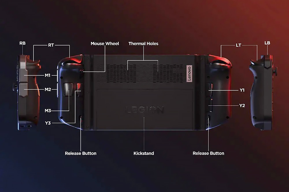 그리고 레노버 리전 고(Lenovo Legion™ Go)의 구조를 살펴보면 다양한 버튼들과 함께 킥스탠드나 마우스 휠과 같은 재미있는 아이디어가 돋보이는 구조가 적용된 것을 확인할 수 있습니다. 참고로 배터리의 용량은 49.2Wh이고 컨트롤러에도 900mAh 용량이ㅡ 배터리가 내장되어 있습니다.