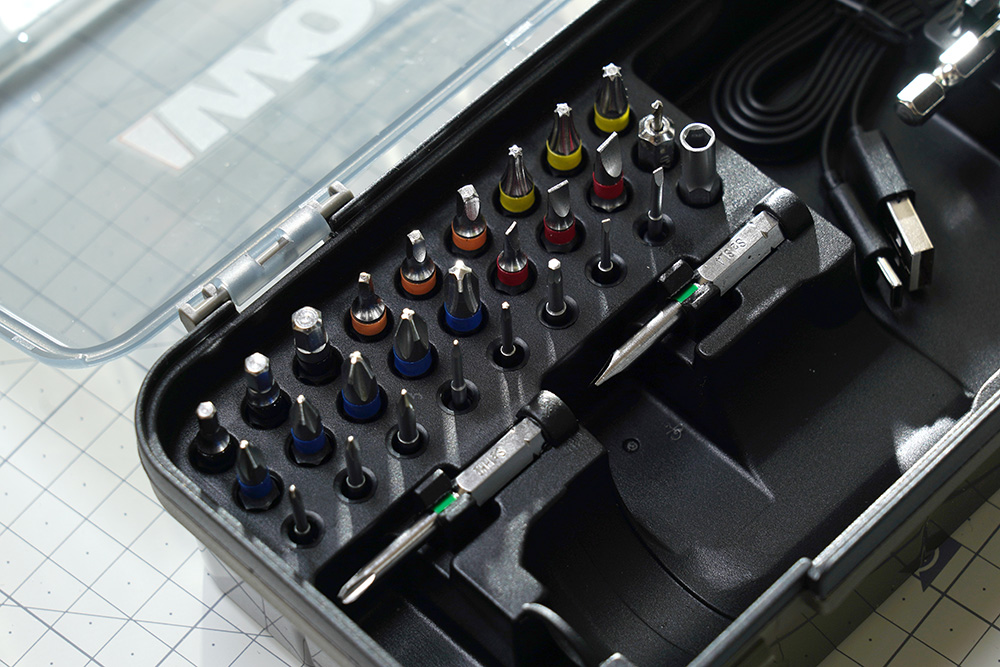 웍스 WX242 2세대 무선 전동 드라이버에는 8종의 정밀 비트와 22종의 일상 비트가 포함되어 있습니다. 보링 비트도 포함되어 있어서 활용도가 높은 편입니다. 그런데 윤활유가 발려있어서 사용할 때 약간 주의가 필요합니다.