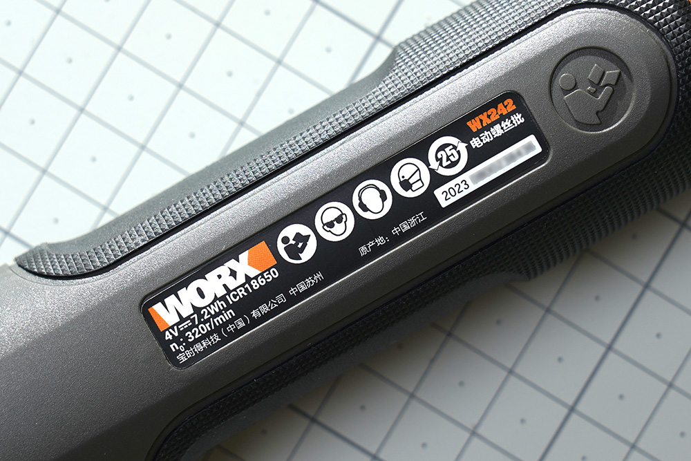 웍스 WX242 2세대 무선 전동 드라이버의 뒤쪽을 살펴보면 정격 전압이 DC 4V라는 것을 확인할 수 있습니다. 그리고 무부하 회전수는 320rpm이고 7.2Wh ICR 18650 배터리가 내장된 것으로 보입니다.