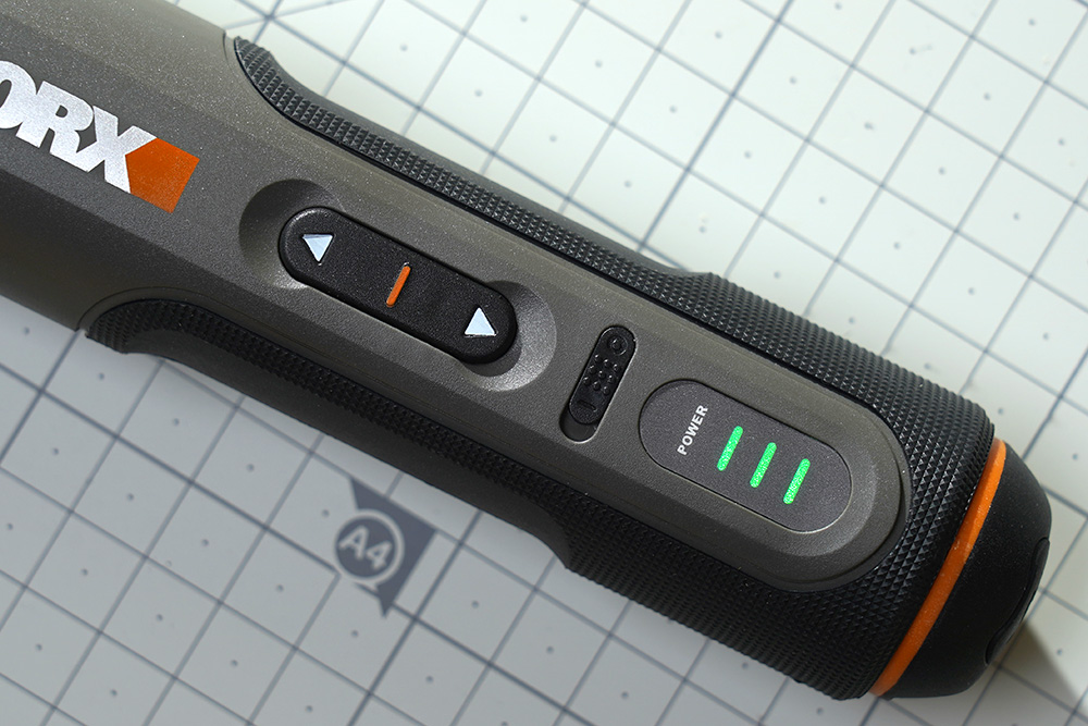 웍스 WX242 2세대 무선 전동 드라이버에는 이중 스위치 설계가 적용되었습니다. 그래서 아래쪽에 배치된 오작동 방지 스위치를 오른쪽으로 당겨야지만 동작하고 정방향과 역방향 버튼을 이용해서 간단하게 조작할 수 있습니다. 그 외에도 아래쪽에 배터리 상태를 확인할 수 있는 LED가 배치되어 있습니다.