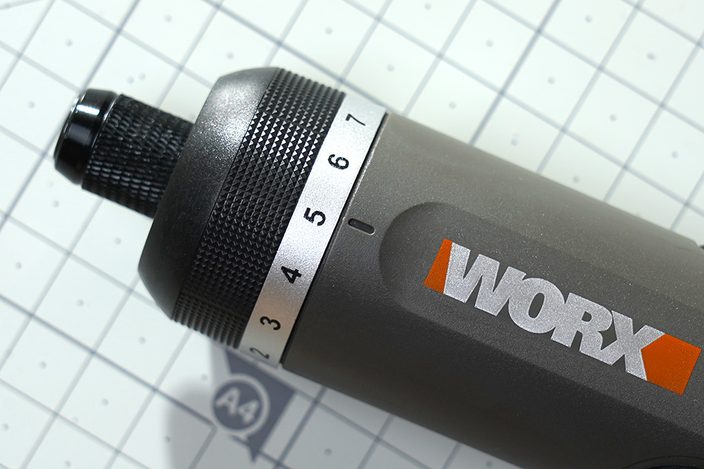 웍스 WX242 2세대 무선 전동 드라이버의 토크는 1~7단계로 설정할 수 있습니다. 참고로 최소와 최대 토크는 0.15N·m, 5N·m입니다. 그리고 토크가 설정치에 도달하면 클러치가 탈락하여서 나사가 파손되는 것을 방지해줍니다.