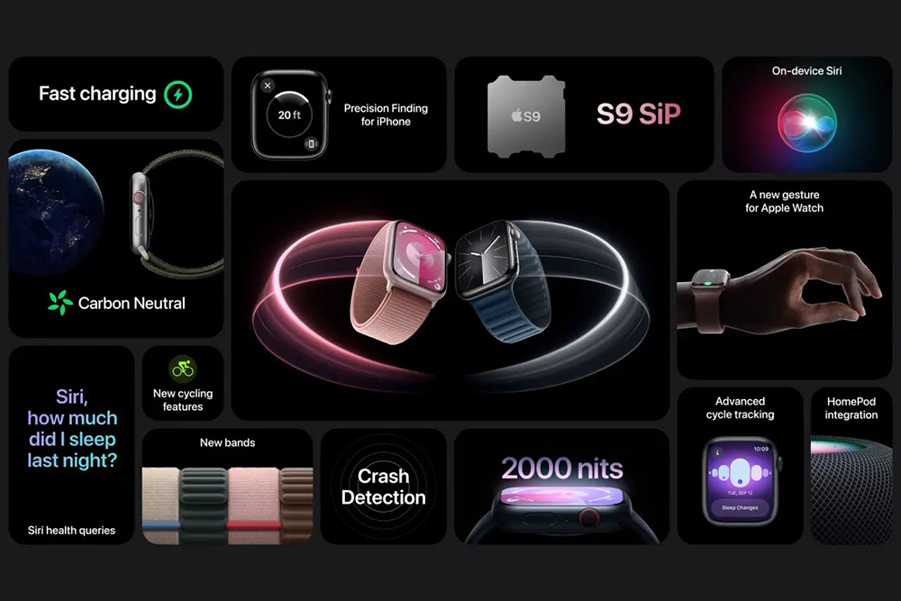 애플워치 시리즈9의 특징은 한 장의 이미지에 정리되어 있습니다. 제가 가장 주목했던 부분은 바로 더블 탭 제스처라고 할 수 있습니다. 직접 화면을 터치하지 않고도 전화를 받을 수 있습니다. 그 외에도 강력한 Neural Engine 덕분에 시리(Siri) 요청들이 온비다이스로 처리된다고 합니다. 클라우드를 거치지 않기 때문에 속도가 더욱 빨라졌다고 합니다. 그 외에도 정밀하게 아이폰을 찾을 수 있는 기능도 탑재되었습니다.