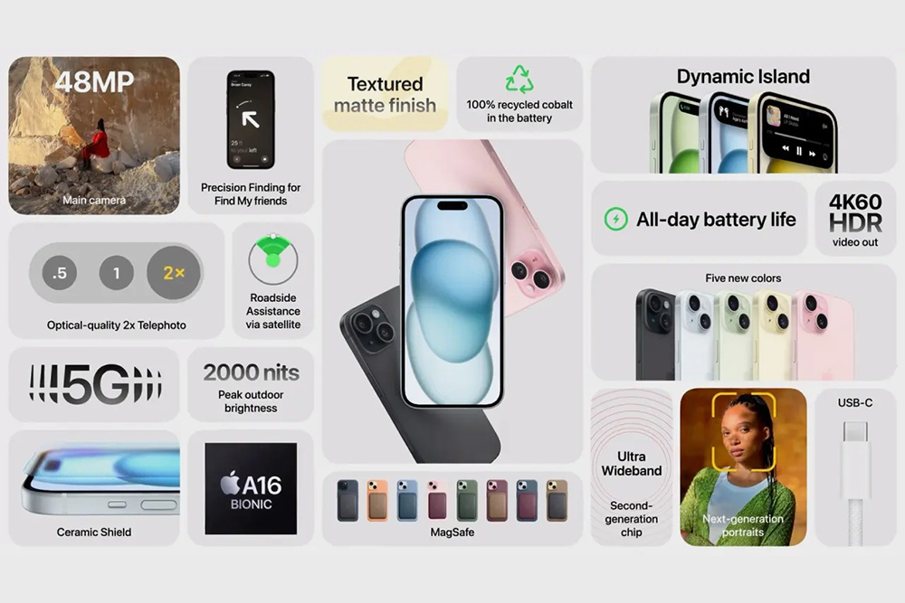 아이폰 15 / 15 플러스의 주요 특징은 위에 있는 2개의 이미지에 정리되어 있습니다. 주목할 만한 부분은 아이폰 14 프로 모델에 적용되었던 다이내믹 아일랜드(Dynamic Island)가 탑재되어서 디자인적인 통일성이 생겼다는 점입니다. 그리고 Apple A16 Bionic 프로세서와 6GB LPDDR5 메모리를 탑재했습니다. 이전 세대의 프로 모델 정도의 성능이라고 생각하면 좋을 것 같습니다.