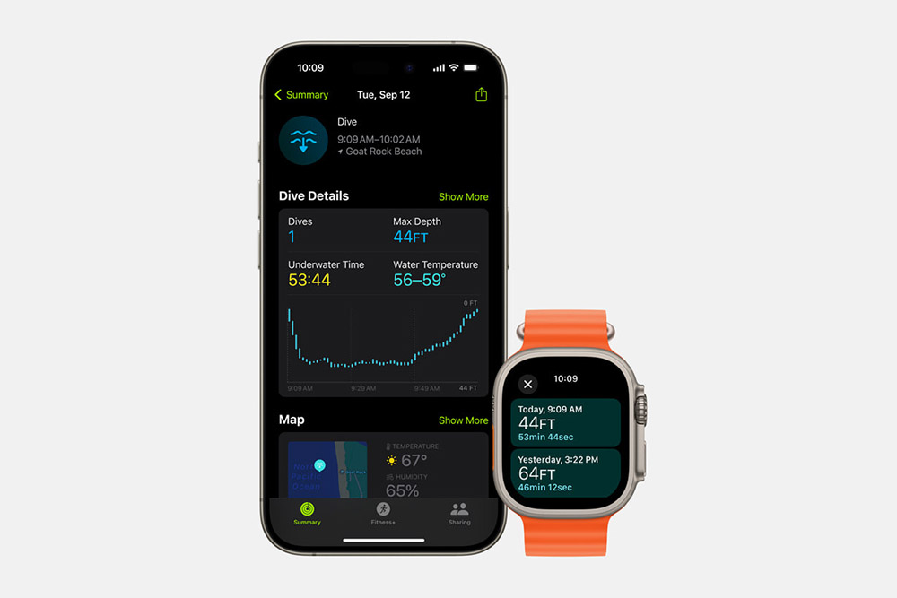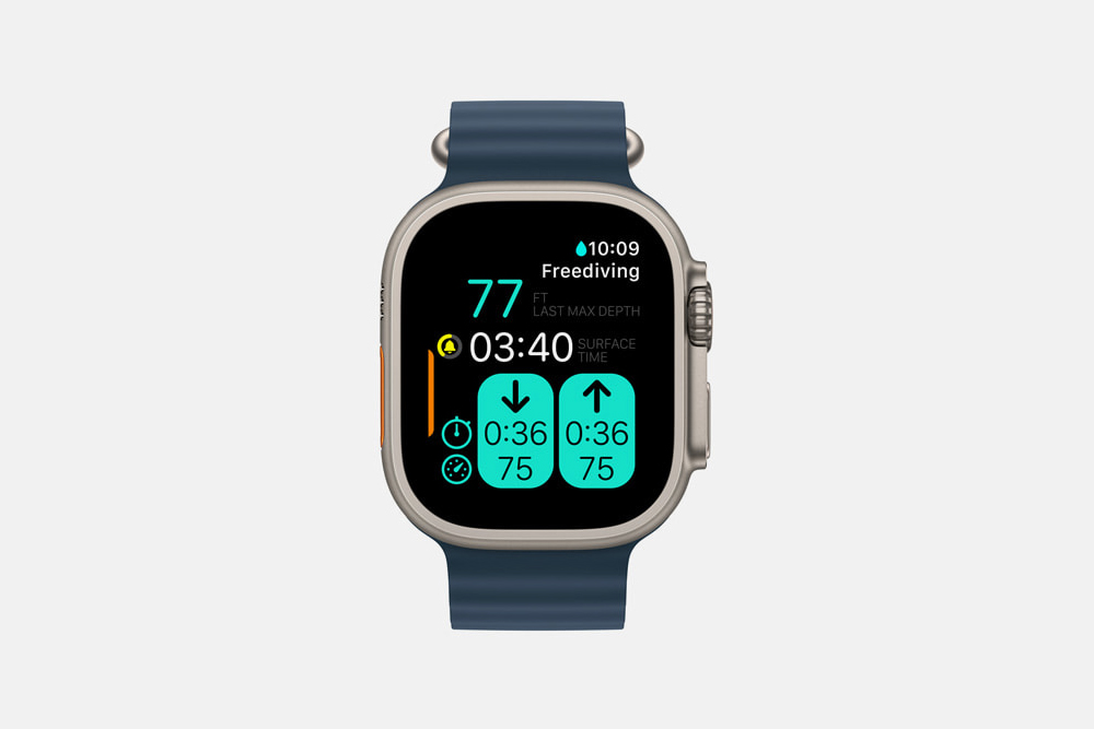 애플워치 울트라2는 카이트서핑이나 웨이크보딩과 같은 익스트림 스포츠는 물론이고 Oceanic+ 앱을 이용해서 최대 40미터 수심에서 스쿠버다이빙이나 프리다이빙을 할 수 있는 기능을 제공합니다.