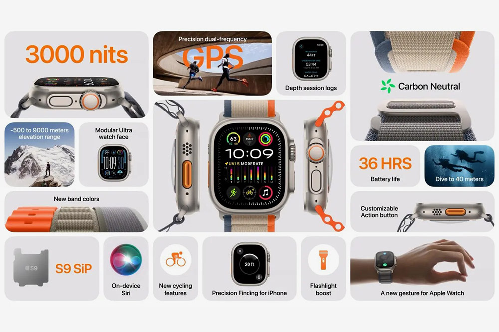 애플워치 울트라2의 특징은 위에 있는 이미지로 한눈에 정리할 수 있습니다. 1세대 제품과 비교해서 차별점은 프로세서가 S8 SiP에서 S9 SiP로 변경되었고 화면의 밝기도 최대 2,000니트에서 3,000니트로 개선되었습니다. 그 외에도 더블 탭 제스처 기능이 추가되었습니다. 참고로 저장 용량도 32GB에서 64GB로 업그레이드되었습니다.