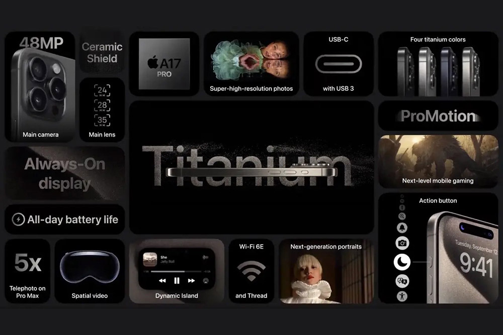 아이폰 15 프로 / 프로 맥스의 스펙을 살펴보면 대만의 TSMC에서 제작한 3나노미터 칩인 A17 Pro 프로세서와 8GB LPDDR5 메모리를 탑재했습니다. 주목할 만한 부분은 USB 3.2 Gen2의 속도를 지원하는 USB-C 커넥터를 채택했다는 점입니다. 그 외에도 가볍고 강력한 티타늄 소재로 제작되었고 무게는 아이폰 15 프로가 187g 그리고 아이폰 15 프로 맥스가 221g입니다, 약 19g 정도가 가벼워졌는데요. 충분히 체감할 수 있는 수치라고 할 수 있습니다.