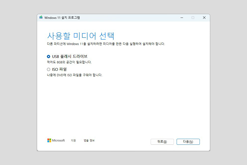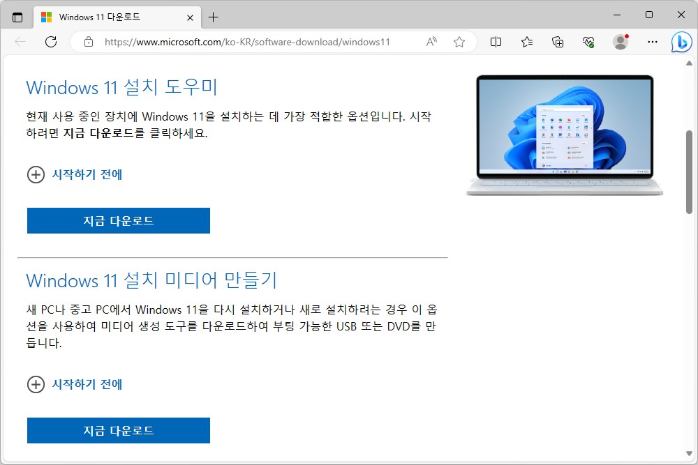 만약 부팅 USB 만들려고 할 때는 Windows 11 설치 미디어 만들기를 선택해야 하고 부팅 DVD를 제작하려는 경우에는 Windows 11 디스크 이미지 (ISO) 다운로드를 선택해서 광학 미디어를 구워주어야 합니다.