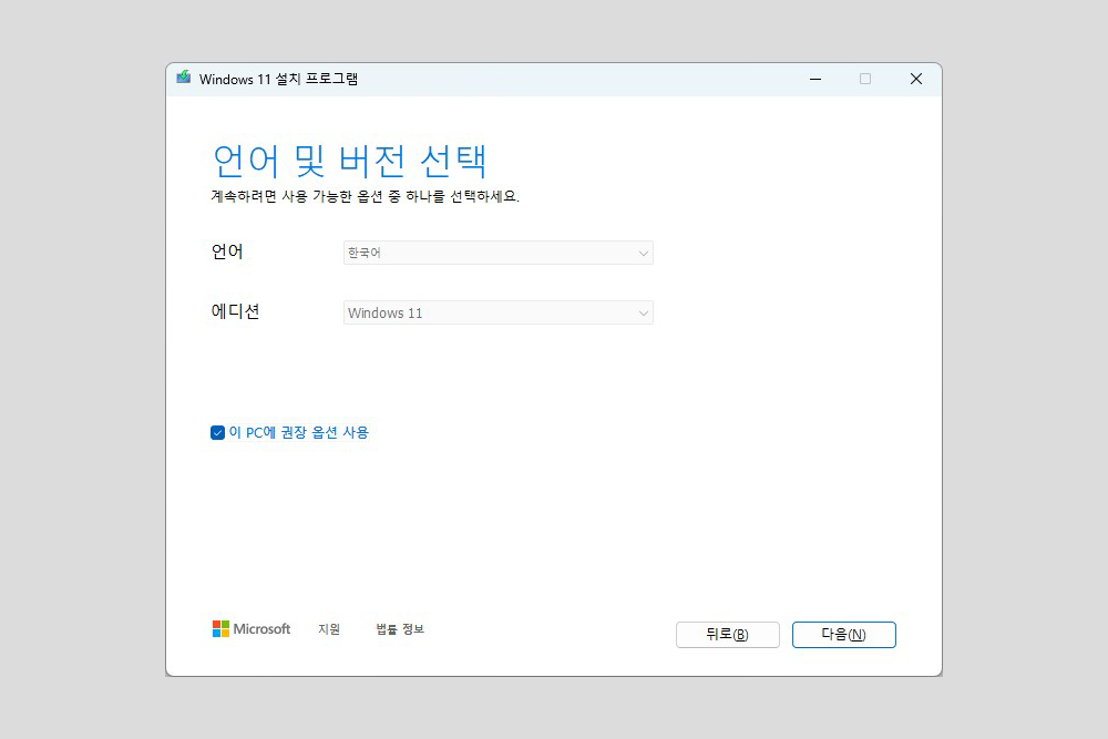 윈도우 11 설치 미디어 만들기를 선택하고 설치 파일을 다운로드 받고 실행시키면 위와 같이 마이크로소프트 소프트웨어 사용권 계약서 관련 동의 과정을 거쳐야 하고 언어(한국어)와 에디션(Windows 11)을 선택할 수 있는 메뉴가 표시됩니다. 참고로 “이 PC에 권장 옵션 사용”을 해제하면 언어를 변경할 수 있습니다.