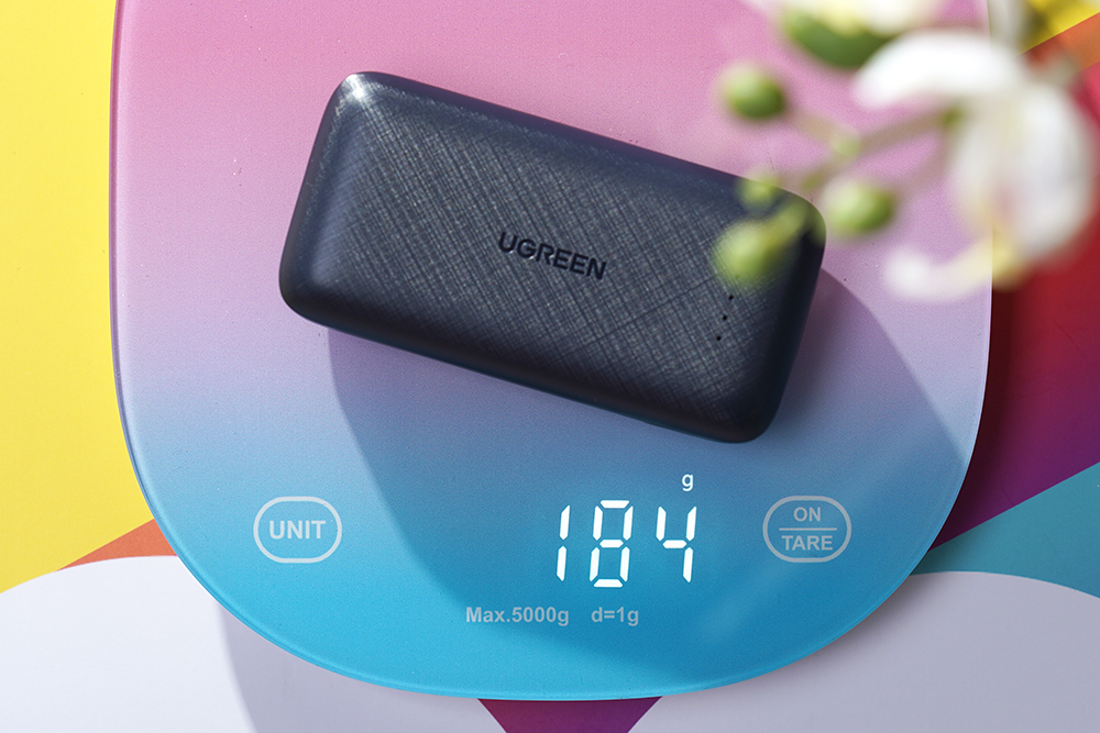 유그린 10000mAh PD20W 보조배터리의 무게는 약 184g(스펙: 181g)으로 측정되었습니다. 역시 해외여행을 갈 때나 일상생활에서 휴대하는데 크게 부담이 되는 편은 아니라고 생각되었습니다. 그렇지만 배터리 제품의 특성상 크기에 비해서는 약간 묵직하다는 느낌을 받게 됩니다.