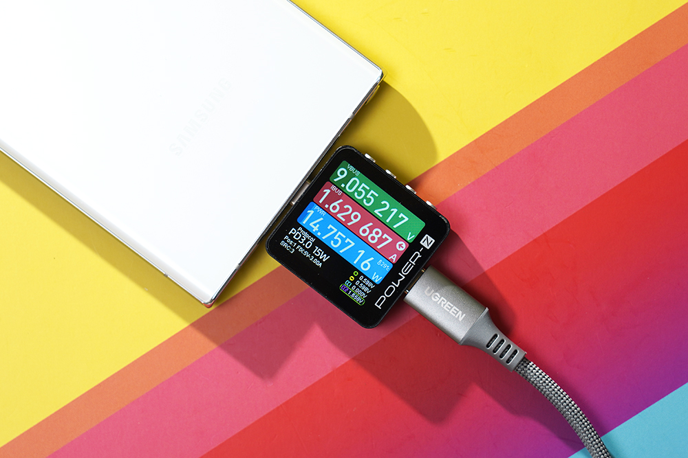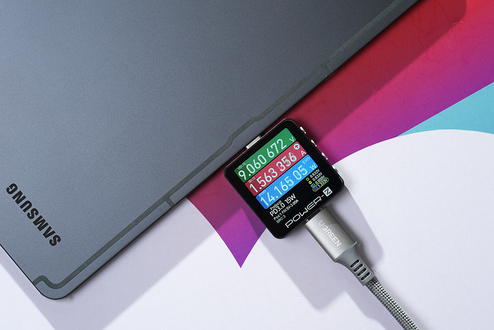 삼성전자의 갤럭시 S22 울트라 스마트폰과 갤럭시탭 S9 울트라를 충전시켜 보면 9V/1.5~1.6=14W 정도로 충전이 진행되는 것을 확인할 수 있습니다. 참고로 아이폰에서도 사용할 수 있습니다.