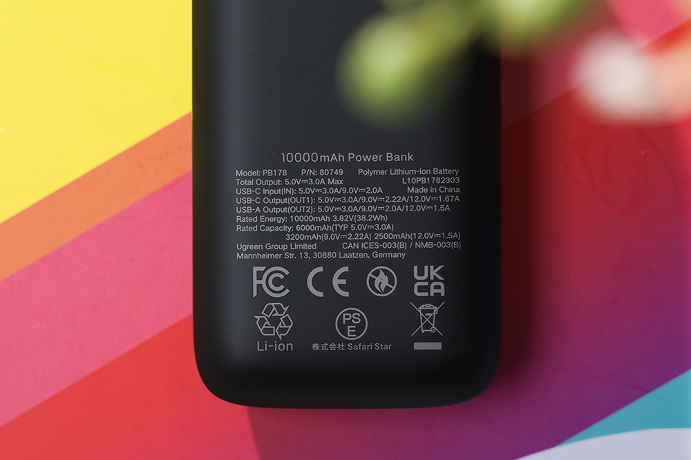 유그린 10000mAh PD20W 보조배터리의 뒷면에는 입력과 출력의 스펙이 표시되어 있습니다. 참고로 모델명은 PB178이고 P/N은 80749입니다. 그리고 뒤쪽은 터치 페인트 코팅이 적용되었습니다.