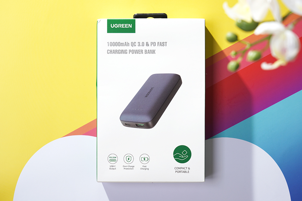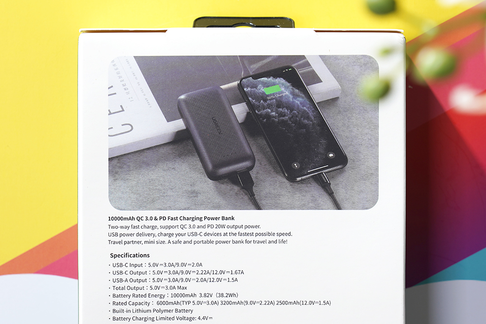 유그린 10000mAh PD20W 보조배터리의 박스는 깔끔한 형태로 디자인되어 있습니다. 그리고 전면에는 10,000mAh 용량의 리튬 폴리머 배터리가 탑재되었고 QC 3.0과 PD 고속 충전을 지원하는 외장배터리라는 문구가 표시되어 있습니다.