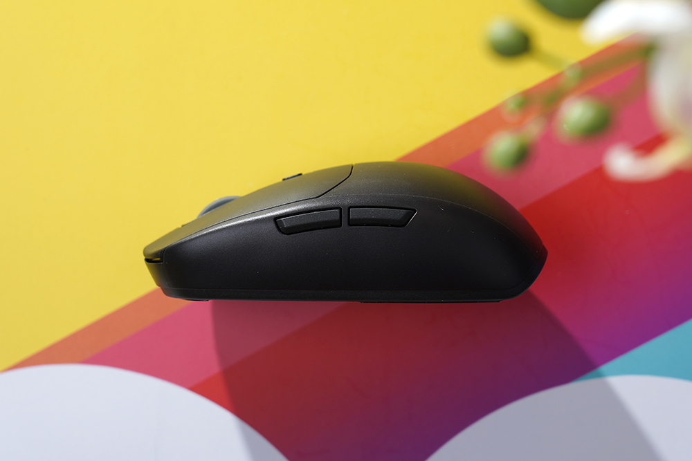 옆쪽에서 유그린 MU103 무선 게이밍 마우스를 살펴보면 손으로 잡기 편하도록 인체공학적인 설계가 적용된 것을 확인할 수 있습니다. 그리고 앞으로 와 뒤로 가기 버튼이 옆쪽에 탑재되었습니다.