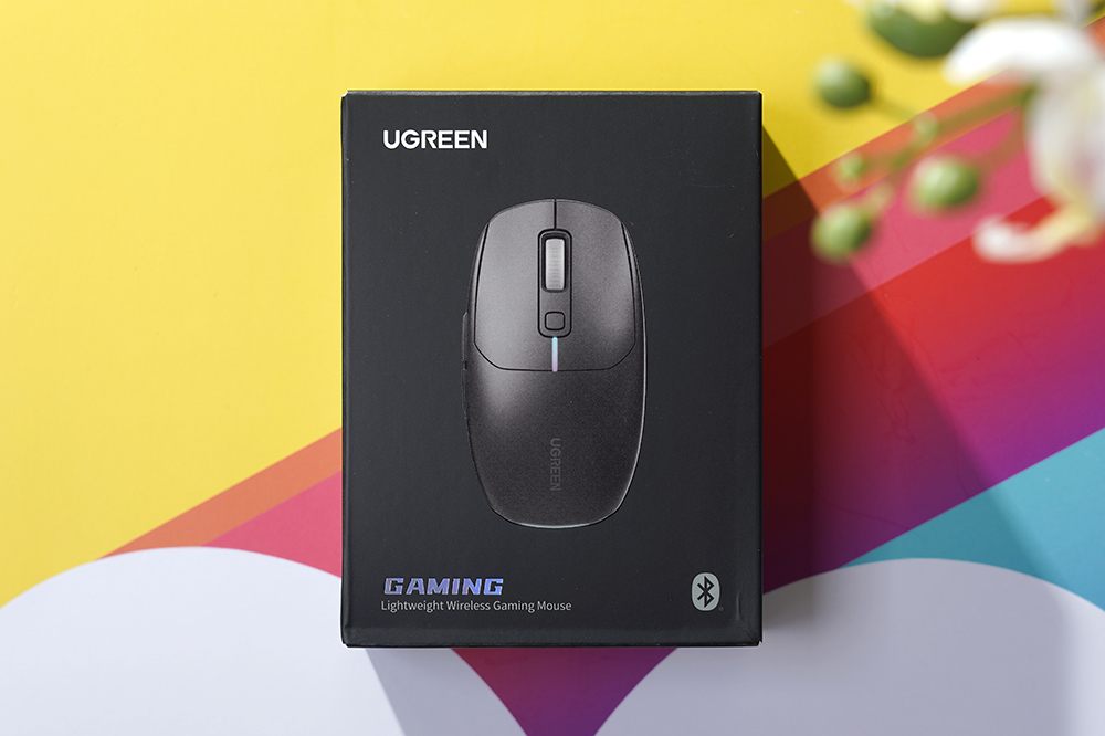 유그린 MU103 무선 게이밍 마우스의 박스는 세련된 스타일로 디자인되었습니다. 그리고 전면에는 가벼운 게이밍 마우스라는 문구와 함께 블루투스 기술을 지원한다는 문구가 인쇄되어 있습니다.
